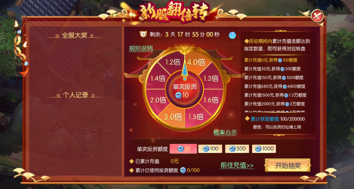 活动说明:玩家累计充值一定金额,可解锁转盘投资总仙缘数额;单次投资仙缘额度玩家可自己选择;玩家投资非绑仙缘,转动转盘即可获得多倍绑定仙缘返利。
